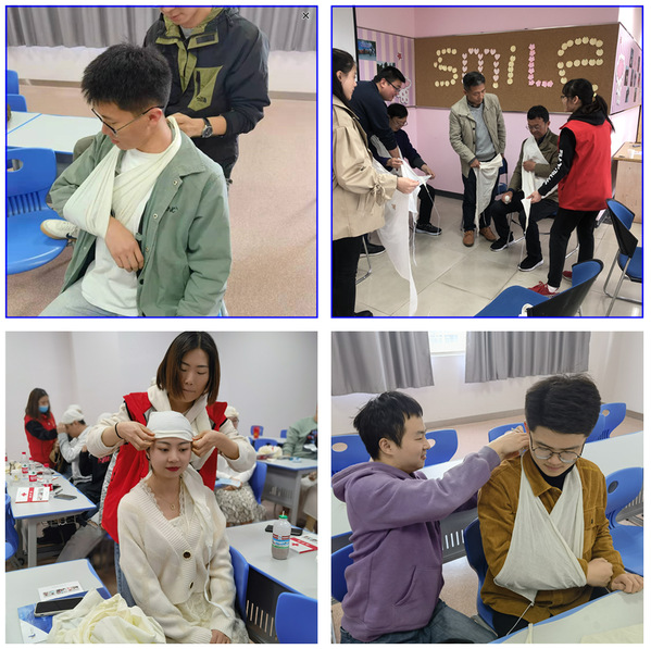 培训过程中,参与培训的师生详细学习了止血、包扎、固定、搬运等救护方法和常见意外伤害应对的方法。同时,课程还安排了对AED的使用规范和CPR(心肺复苏)进行现场示范和操作训练。在讲解心肺复苏时,老师用理论讲述和实际演示对心肺复苏的全过程“判断患者有无意识、呼救、清理口腔分泌物、开放气道、人工呼吸、胸外心脏按压”等环节进行了详细的讲解,对每一环节的体位及各种手法等细节都一一进行详细演示。