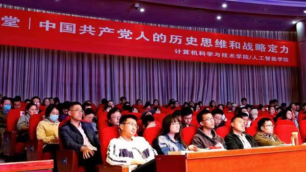 4月28日下午,计算机科学与技术学院/人工智能学院首期“石榴红课堂”在将军路校区一号楼四楼报告厅成功举办。马克思主义学院副院长何畏作题为《中国共产党人的历史思维和战略定力》的主题报告,学院教工支部党员、学生支部党员以及学生代表两百余人共同聆听本场有政治高度、有理论深度的思政金课。本次活动由学院团委书记耿瑞主持。