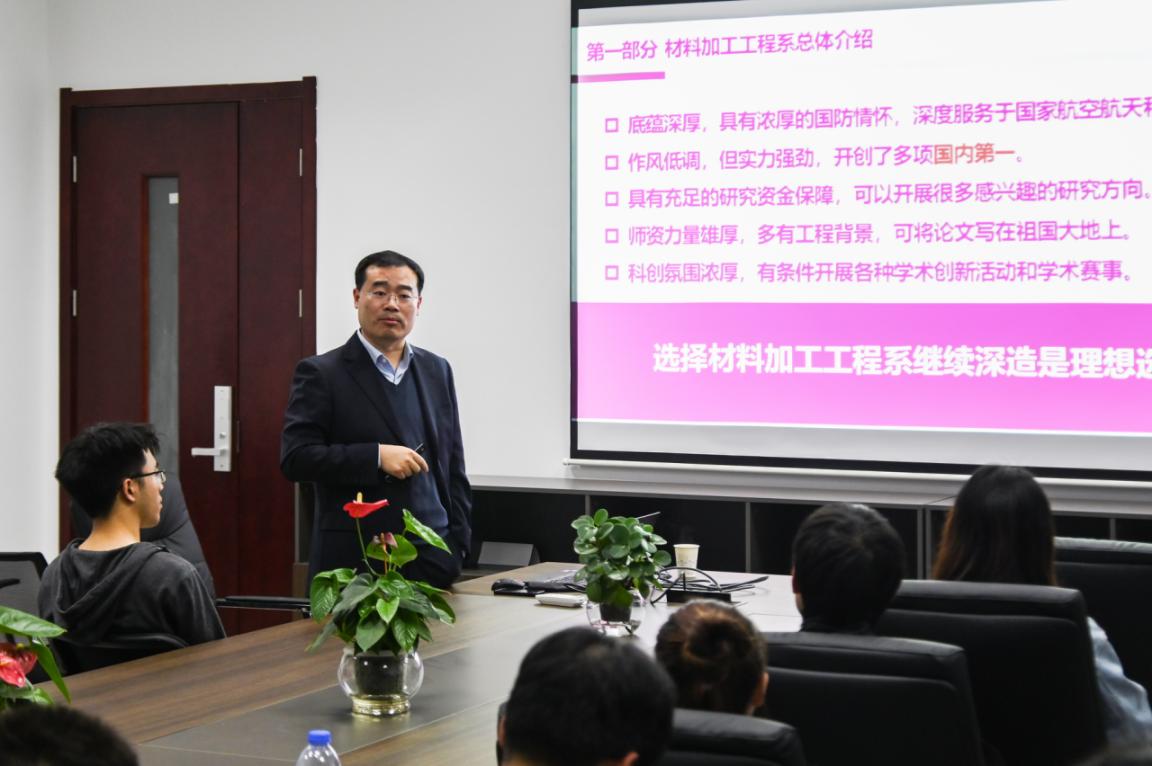 本次活动邀请到材料加工工程系主任郭训忠担任主讲。郭训忠首先表明材料加工工程系的底蕴深厚,具有浓厚的国防情怀,是深度服务于国家航空航天和国防军工的专业,并对加工系中的金属材料及热处理、焊接工艺及设备、高分子与复合材料、功能材料与应用这四个研究方向进行了详细介绍。紧接着,他向同学们分享了材料加工工程系各位老师的研究课题,表示材料系的作风低调,但是实力强劲,在老师和同学们的努力下,开创了多项国内第一。