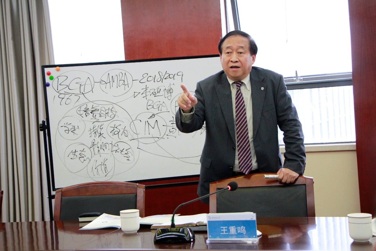 学校和学院领导对王重鸣的来访与指导表示热烈的欢迎和衷心的感谢。周德群介绍了学院的基本情况,谢嗣胜简要汇报了学院BGA认证工作的进展情况。