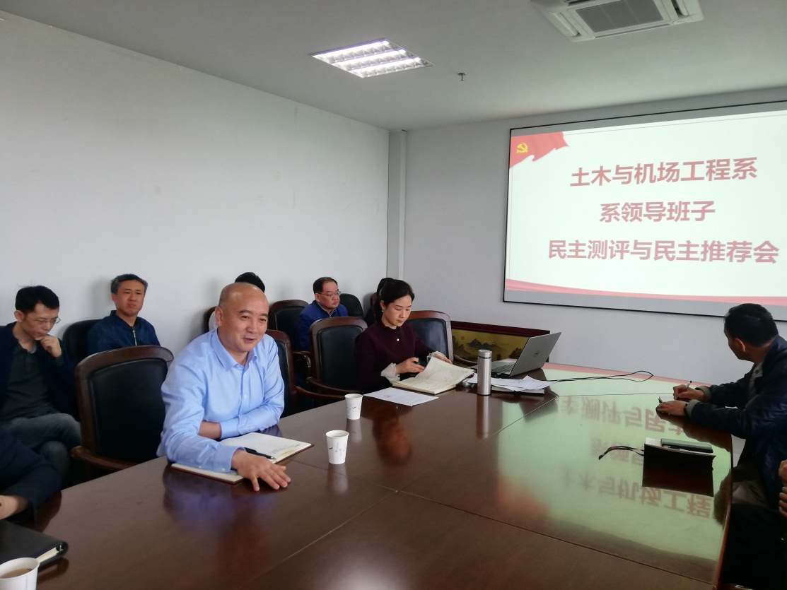 4月29日下午,民航学院土木与机场工程系行政班子和党支部换届工作在学院801会议室举行。土木与机场工程系全体教师及党员参加会议,学院党委书记刘建成、副书记李和新到会指导工作。
