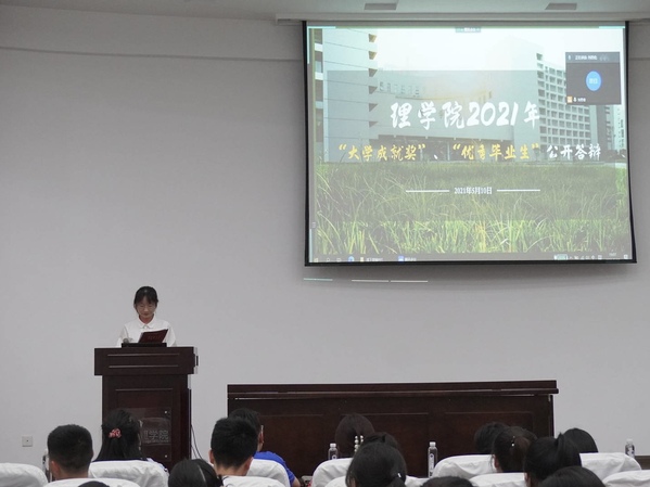5月10日,理学院2021届本科生大学成就奖、优秀毕业生院内答辩评审会在理学院一楼报告厅举行并同步进行了线上直播。学院团委书记欧珊,教师代表潘星宏、顾晓蓉以及各年级辅导员参加了此次评审,2020级全体本科生到场观摩学习,其他年级学生观看了线上直播。
