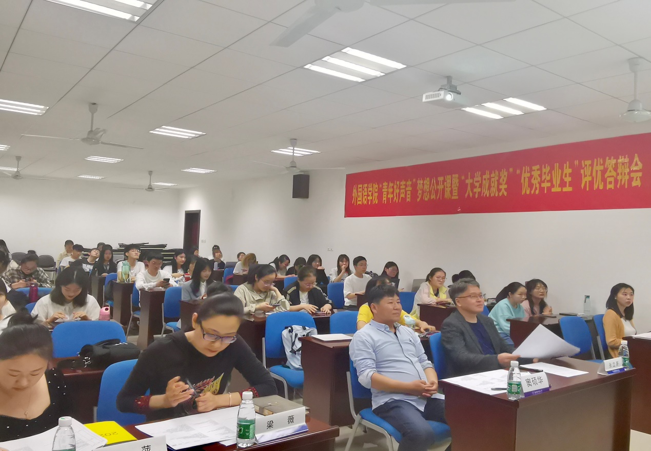 5月7日下午,外国语学院开展“青年好声音”梦想公开课暨“大学成就奖”、“优秀毕业生”评优答辩会。院党委副书记梁薇,英语系主任张立新,日语系主任窦硕华,院团委书记李萍,本科生辅导员盛嘉贤、彭欢作为评委参加了这次答辩,参加本次评优答辩会的还有各年级学生代表。