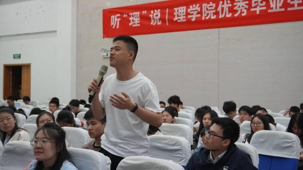 5月10日晚,听“理”说——理学院优秀毕业生分享交流会在理学院报告厅举行。本次活动邀请到三位理学院2017级优秀毕业生从学习、科创、竞赛等方面进行分享。理学院2019、2020级的同学到场聆听学习。