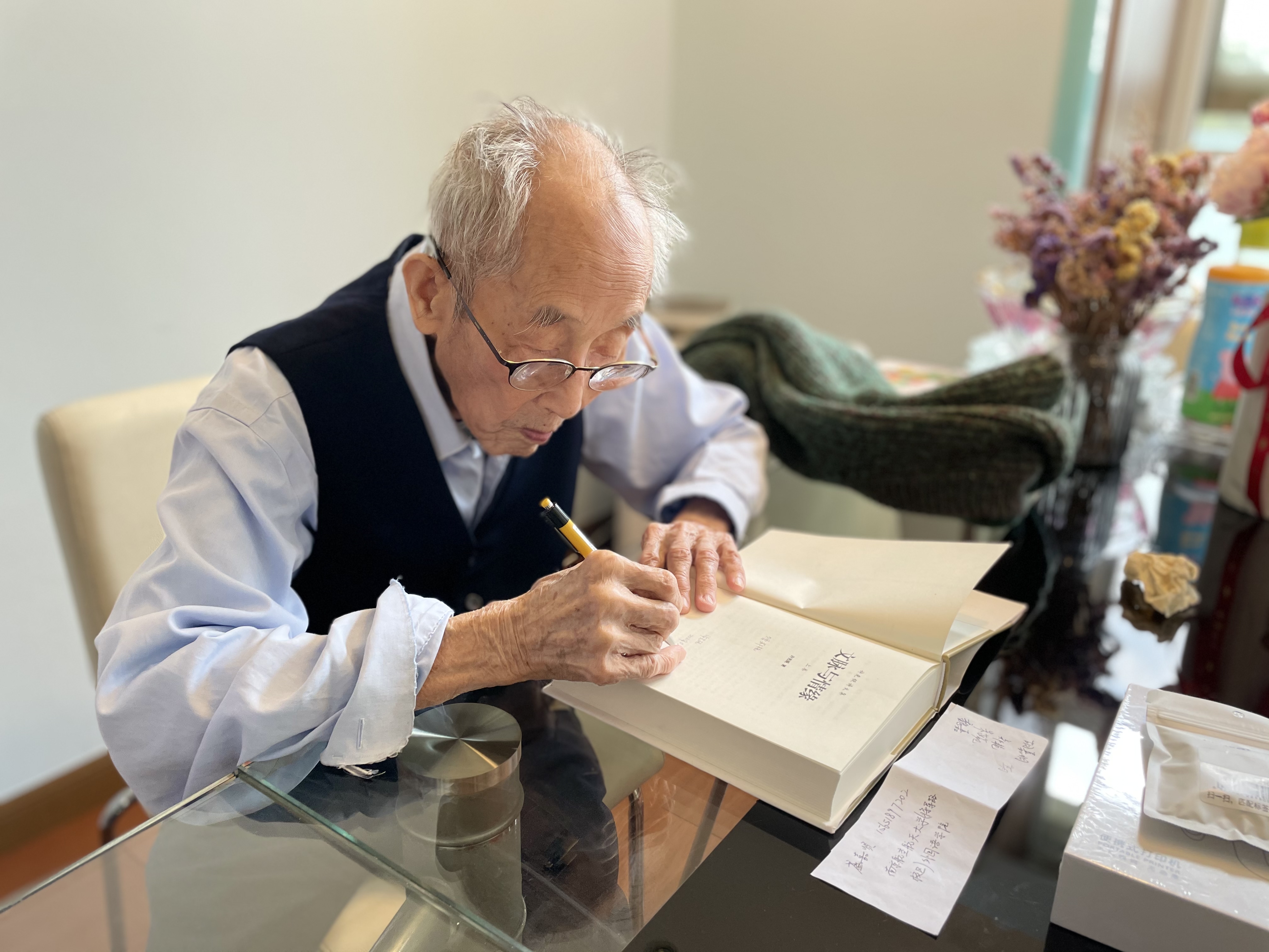 最后,许老向前往的党员同志们赠予了自己思想的结晶——诗歌集《文脉与情缘》,并认真给每位同志写下赠语,鼓励青年人不懈追求真善美,用知识报效祖国。许老用真诚打动了在场的每个人,大家在被许老渊博学识震撼的同时,更立志要循着许老的脚步,将个人发展和祖国发展紧密联系,和党同心同向同行。