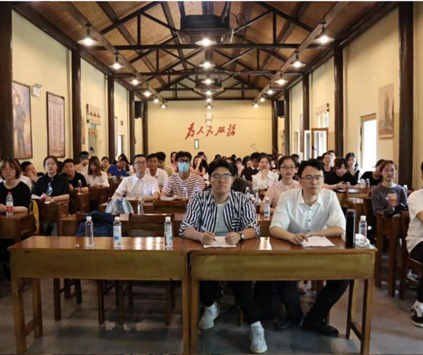 在参观之后,全体师生在李巷培训室召开座谈交流会,支部书记朱一豪领学了《习近平对“大学之道”的诠释》,康冲主讲《江苏四种革命精神的时代价值》专题党课,各位发展对象针对党史学习教育情况、对党的认识理解、为学生办实事情况进行了答辩展示。