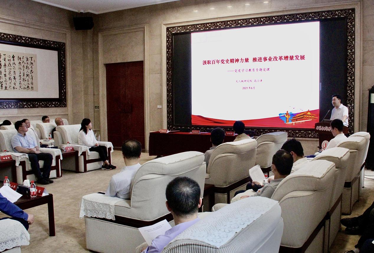 仪式上,高小泽作题为《汲取百年党史精神力量 推进事业改革增量发展》的党史学习教育专题党课。通过回顾党在四个历史时期的历史贡献,总结百年党史的的宝贵经验和精神伟力,汲取党史力量投身于无人机研究院事业改革发展。胡飞杰、裴锦华、王超分别介绍本单位概况,并就党建工作进行交流发言。