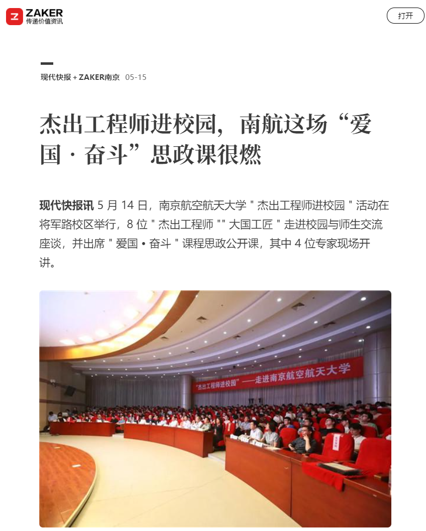 现代快报:杰出工程师进校园,南航这场“爱国•奋斗”思政课很燃