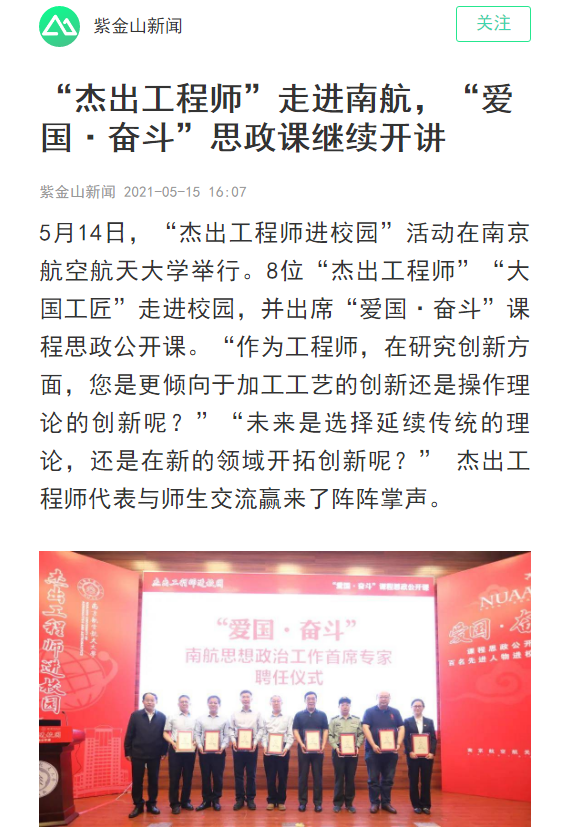 南京日报:“杰出工程师”走进南航,“爱国·奋斗”思政课继续开讲
