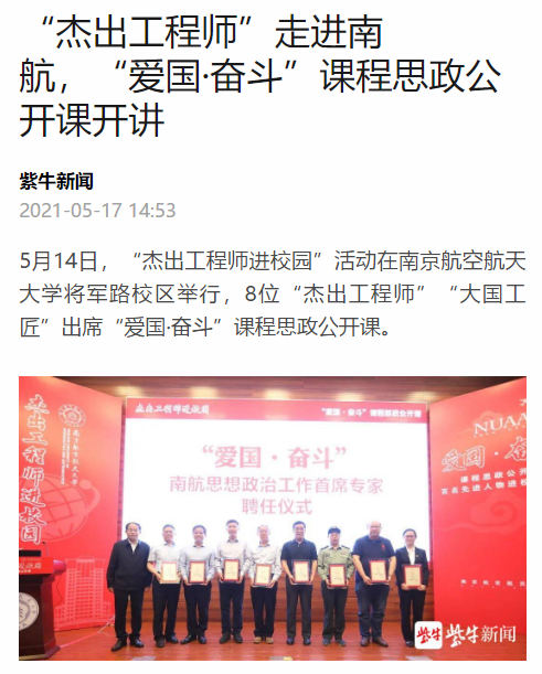 扬子晚报紫牛新闻:“杰出工程师”走进南航,“爱国·奋斗”课程思政公开课开讲