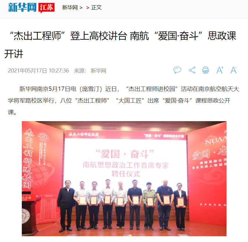新华网:“杰出工程师”登上高校讲台 南航“爱国·奋斗”思政课开讲