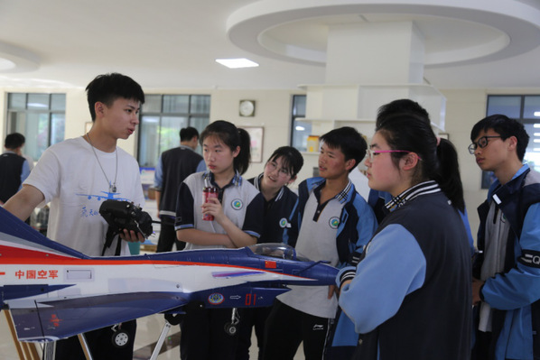 在本次航空航天科技作品展中,我校展出了歼10飞行表演机、共轴反桨涵道矢量推力无人机、特级F3D、共轴六旋翼无人机攻击系统、火星信标系统、教育卫星系统、矢量推力火箭等科技作品,吸引了一大批清中同学们到现场观摩学习并与志愿者们积极互动。