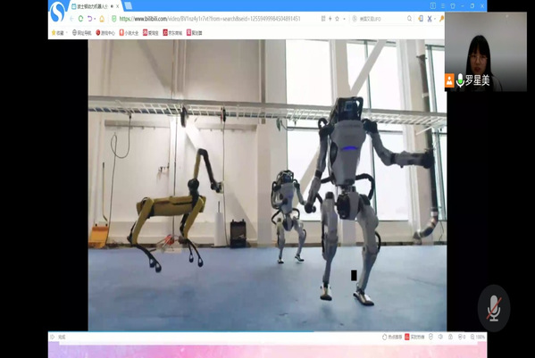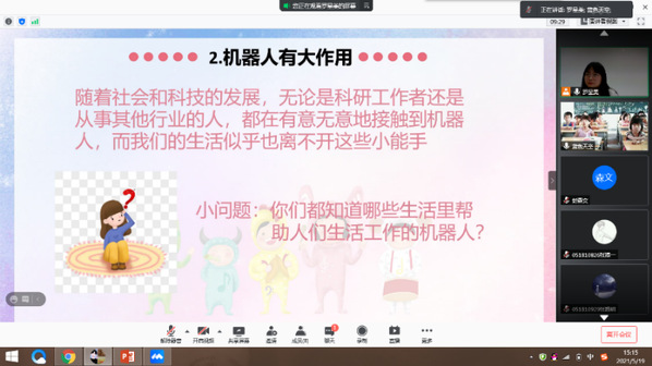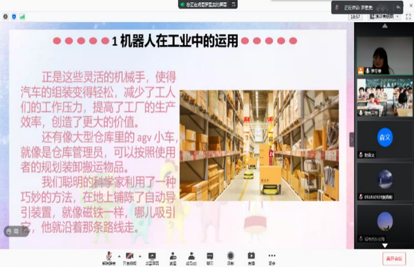 接下来,罗星美同志从工业、农业、服务业、科研、军事、医疗等六个方面向给同学们讲解了目前机器人的现实应用。教学依托线上多媒体的优势,在介绍热门机器人时穿插趣味视频,诸如太空机械手、大型仓库里的AGV小车、帮助果农采苹果的机器人、拆弹机器人等,使整个教学过程图文并茂且寓教于乐。同时,罗星美同志适时融入互动环节,调动孩子们的积极性,提升课堂教学的实效性。