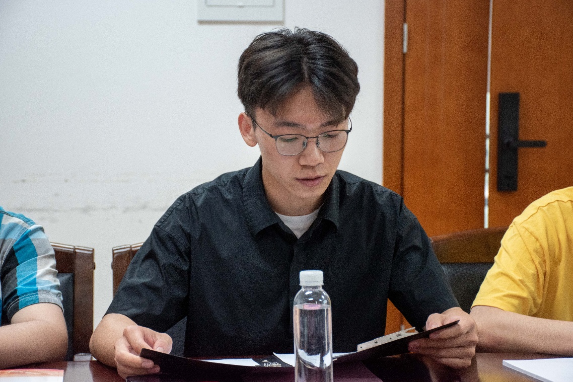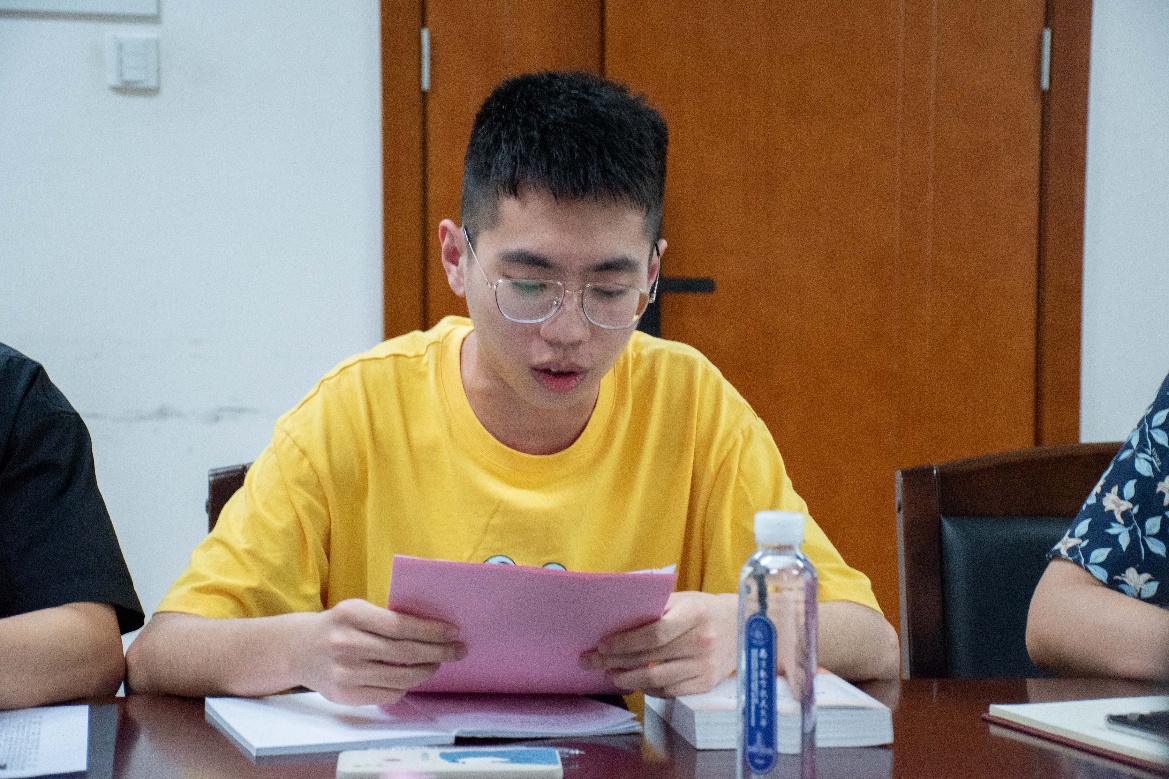 0218100团支部代表陈嘉分享他的学习心得。他表示对于大学生而言,要尽早提高律己意识,从现在的法律法规、校规校纪开始学起,规范自我。对于学生干部而言,更要防微杜渐,保持思想先进,把服务同学放在首位,在纪律的指引下砥砺前行。