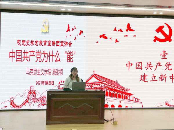 施张桐以《中国共产党为什么“能”》为宣讲主题,重点围绕四点展开讲述:一是为什么能建立新中国;二是为什么能收拾好国民党留下的烂摊子;三是为什么犯了严重错误还能得到人民支持;四是为什么能取得现代化建设的巨大成就。她以历史为依据,深入浅出的讲出了中国共产党为什么能。正是依靠中国共产党有远大的理想追求,有科学的理论引领,有选贤任能的机制,有严明的纪律规矩,有自我革命的精神,有强大的领导能力等诸多优秀特质,中国共产党成为始终走在时代前列、人民衷心拥护、勇于自我革命、经得起各种风浪考验、朝气蓬勃的马克思主义执政党。