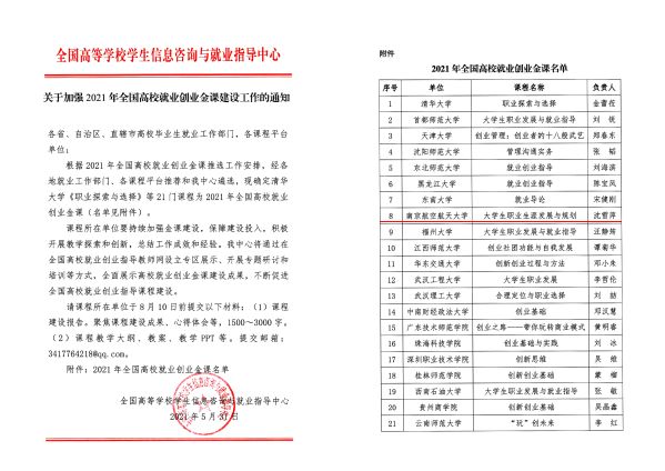 5月31日,全国高等学校学生信息咨询与就业指导中心公布了2021年全国高校就业创业金课名单。经过江苏省推选、教育部遴选等环节,我校《大学生职业生涯发展与规划》课程获评首批全国高校就业创业金课。此次全国共21门课程入选首批就业创业金课,江苏省仅2门课程入选。