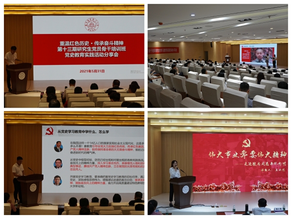 本次党史学习教育实践活动分享会在展示实践教育成果的同时,考察并提高实践学习质量,加深了党员骨干对党的精神谱系的体会与思考,让红色精神根植校园沃土。自开展党史学习教育以来,面向研究生党员骨干,研工部以研究生党员骨干培训班、“引航计划”博士创新培优班为抓手,开展了专题党课、党务培训、行业单位走访、红色实践;以网络学习教育覆盖全体研究生党员,组织研究生党支书参加全国高校党史学习教育专题网络培训,开辟“‘航小研’说党史:今天我是领学人”、“五好”导学团队学党史专栏;丰富研究生校园文化,开展“汲取党史力量·强健师生体魄——跃动研途·导学同行”首届导学运动会、“乐动研途颂百年”庆祝建党100周年研究生美育音乐会等活动,用研究生喜闻乐见的方式丰富了党史学习载体、创新学习实践形式,提升了思政教育实效,推进党史教育走深走实。