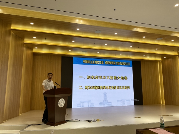 随后,校党史学习教育宣讲团成员、马克思主义学院徐军教授为在座研究生党员骨干讲授《牢固树立正确党史观,旗帜鲜明反对历史虚无主义》专题党课。徐军从全面认识学习党史在新时代的重要意义切入,从前车之鉴、当前形势和我国实际三个方面,剖析了历史虚无主义的脉络、危害和本质,阐述了要在历史唯物主义科学指导中牢固树立正确党史观,正本清源、固本培元,牢固树立中国特色社会主义共同理想和共产主义远大理想。