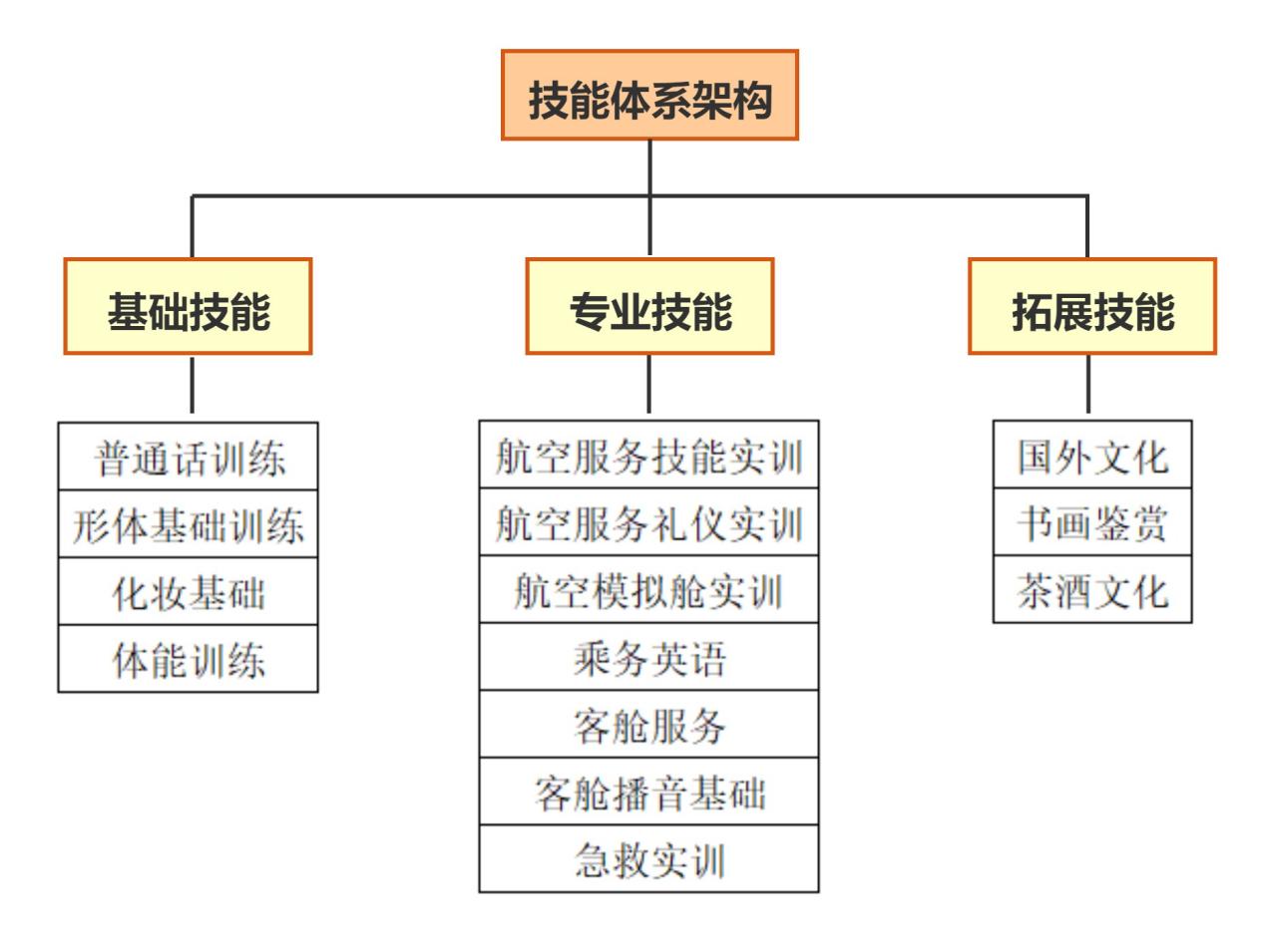 适应职业岗位要求,做学结合、知行合一。构建了基础技能、专业技能和拓展技能组成的技能体系,如图2所示。《形体训练》等基础技能要求学生通过课内外大量的训练达到“身心合一”的状态;《航空服务技能实训》等专业技能要求学生熟练使用;《国外文化》等拓展技能有助于学生在工作中表现更突出。在技能课教学中,都融入了相应的理论知识作为支撑,如在《航空服务礼仪实训》课中讲解站姿时,不仅讲有几种站姿的身体表现,还介绍不同站姿表达的意境和气质以及适合的场合,让学生真正做到“知其然、知其所以然和知其如何然”。
