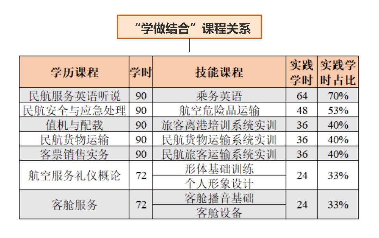 打牢专业理论基础,学做结合、学以致用。实践有助于对理论知识的理解和迁移应用,学历课程中重要和难以理解的知识点,在技能课程中设置适当的训练,在“学”的过程中用必要的“做”加深理解和提高应用能力。如:学历课中的《值机与配载》等较难理解的专业核心课程设置了对应的独立的技能实训课,学时占比40%,《客舱服务》等较重要的专业课在不同的适合的技能课中设置相应的实训内容。