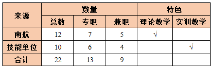 本专业师资队伍为“双师型”,一方面是来源于南航的师资;另一方面是来源于技能单位的师资。理论教学与实训教学特色明显的两支师资队伍互补互融构建了标准的“双师型”教师队伍。