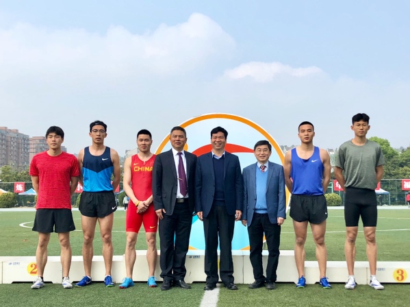 校领导参加校运会田径比赛为运动员颁奖并合影留念