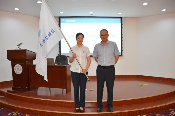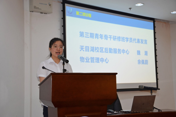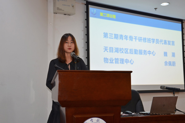 开班式上,后勤集团总经理贡建伟代表集团为第三期青年骨干研修班授旗。佘佩蔚、魏潮代表青年骨干研修班学员发言。