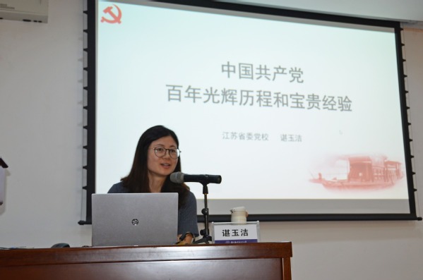 开班仪式结束后,江苏省委党校党史党建教研部副教授谌玉洁为大家讲授了研修班第一课——《中国共产党百年光辉历程和宝贵经验》。谌玉洁以习近平总书记在党史学习教育动员大会上的讲话开始引入,从开天辟地、改天换地、翻天覆地、经天纬地四个阶段,系统总结回顾了党领导人民逐步实现救国、兴国、富国、强国奋斗目标的百年辉煌历程,在此基础上,总结提炼了必须推进马克思主义中国化、必须坚持以人民为中心、必须坚持和加强党的领导三条宝贵经验。
