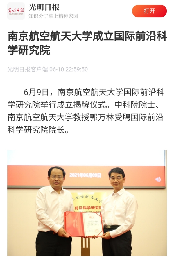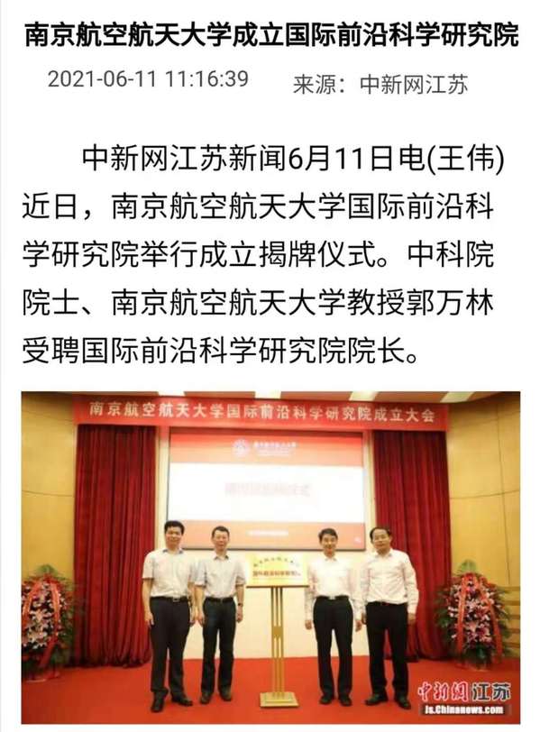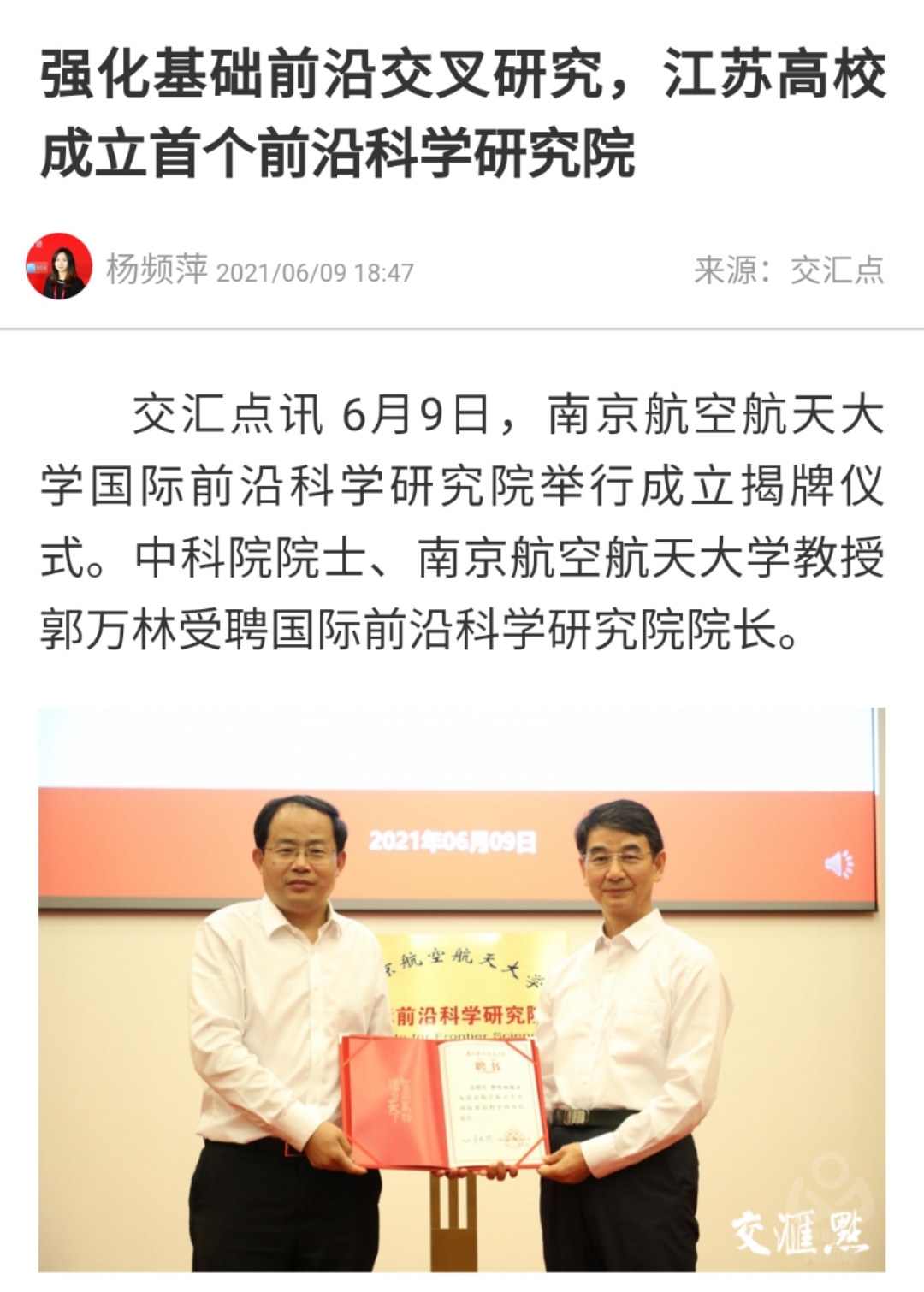 编者按:6月9日上午,南航国际前沿科学研究院成立大会在明故宫校区举行,南航前沿院将打造促进学科深度交叉融合、推动新兴交叉学科方向发展的高水平科技创新和人才集聚平台,前沿院的成立也受到了新华社、光明日报、新华日报、科技日报等多家主流媒体报道,现转发相关报道如下: