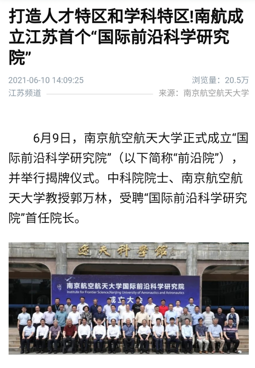 新华社:打造人才特区和学科特区!南航成立江苏首个“国际前沿科学研究院”