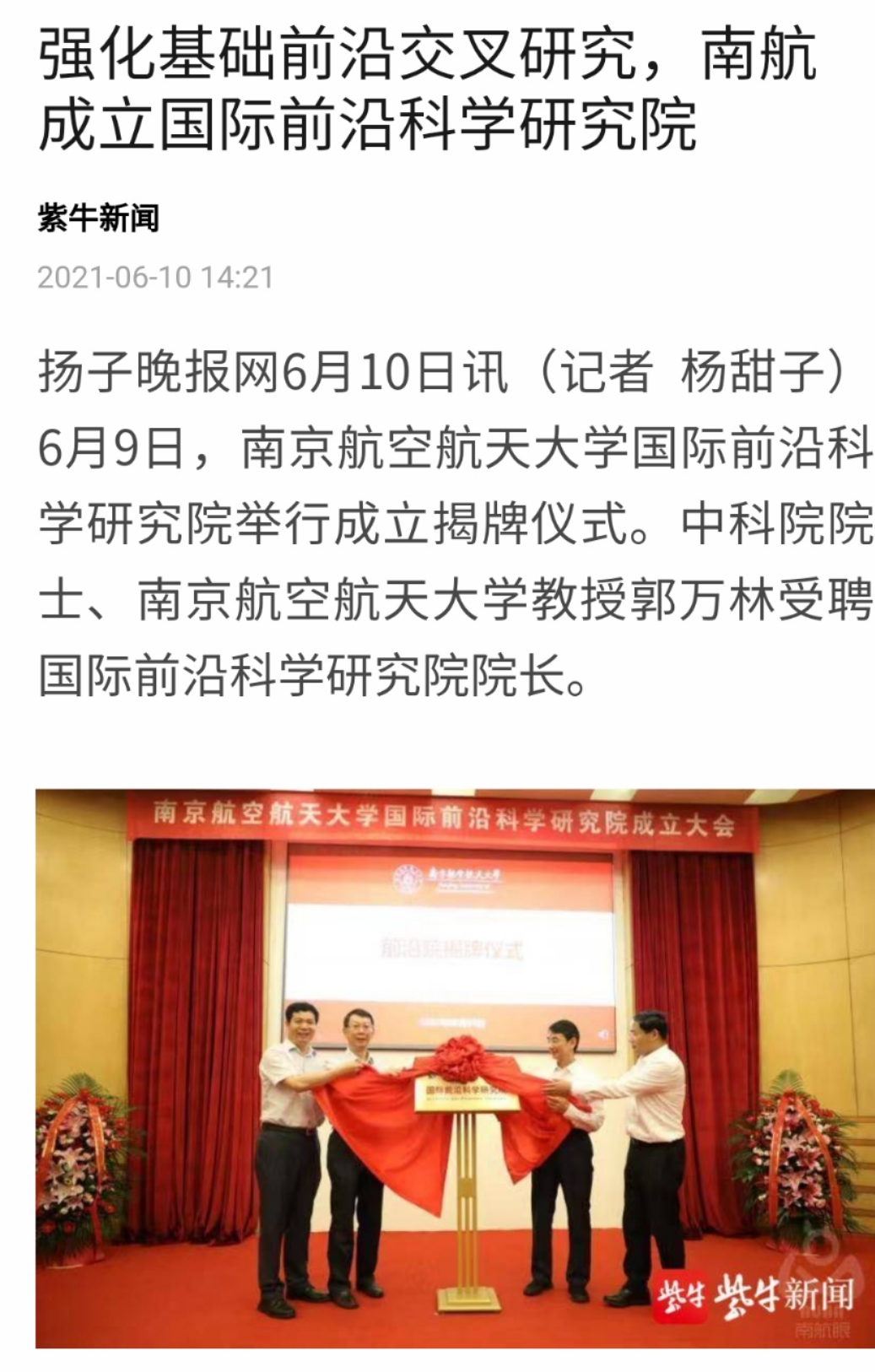 扬子晚报紫牛新闻:强化基础前沿交叉研究,南航成立国际前沿科学研究院