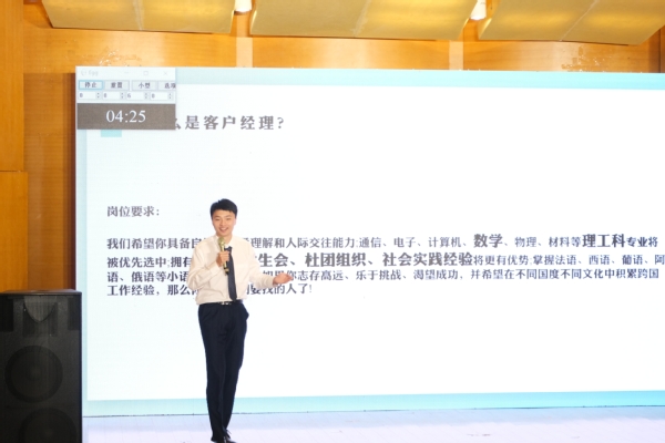 在现场,选手还播放了在导师指导下制作的“职业人的一天”视频,市场总监、产品运营、客户经理、工程师、翻译、新闻记者等职业典型一天的工作生活状态透过参赛选手进入企业,亲历职场情景,在视频中娓娓道来。理学院的陈宇鸿在视频中讲述了作为一名华为客户经理的胜任力及职业理想。从了解客户需要再到同不同产品环节沟通、业务讲解,再到对客户的回访,从细节中呈现了对爱国企业的向往。计算机科学与技术学院/人工智能学院的费珂同学在视频中表达了作为一名大数据分析工程师的职业素养与使命担当,作为南航工科学子,严谨、细致、有责任心是作为一名利用科技手段服务民生的工程师的必备素养。