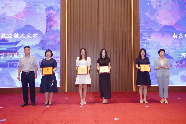 江宁区委创新办常务副主任、江宁科技局局长贝淑芳与南京汤山温泉旅游度假区党工委副书记、管委会主任戎云宝共同为优秀组织奖颁奖