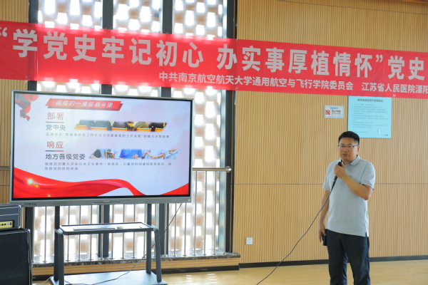 6月25日,中共南京航空航天大学通用航空与飞行学院委员会、江苏省人民医院溧阳分院、溧阳市人民医院联合开展“学党史牢记初心,办实事厚植情怀”党史联学活动。溧阳市人民医院党委书记朱宁玉、江苏省人民医院溧阳分院、溧阳市人民医院的领导和工作人员、通用航空与飞行学院党委副书记贡海俊及学院师生代表共60余人参与活动。