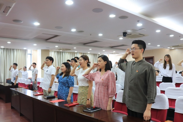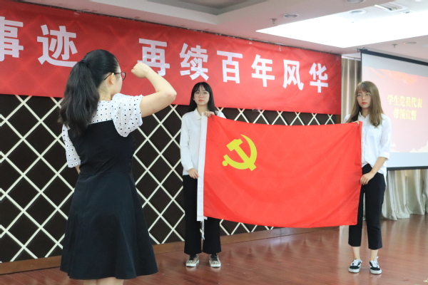 紧接着,在党员代表卢宇凌的带领下,全体在场党员面对鲜红的党旗,高举右拳,字字铿锵,重温入党誓词。在党旗前庄重宣誓,始终以一名优秀党员的标准鞭策和激励自己,立足现阶段,在学习百年党史的过程中,不忘初心,赓续革命精神;在实现伟大中国梦的进程中,牢记使命,不断砥砺前行。