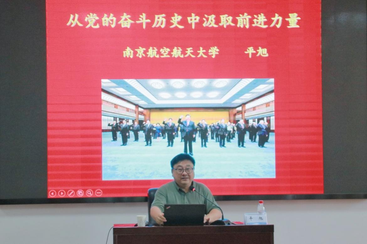 随后,平旭作《从党的奋斗历史中汲取前进力量》主题报告。他从习近平总书记在参观中国共产党历史展览馆时发表的重要讲话出发,深入阐述“两个大局”的思想内涵和相互关系,再次强调了党史学习教育的重大意义。接着,他围绕“如何正确认识党的百年历史”问题,通过重要事件和人物故事渐次展开,生动展现了中国共产党百年来的不懈奋斗史、不怕牺牲史、理论探索史、为民造福史和自身建设史。最后,他结合习近平总书记在清华大学考察和两院院士大会上的重要讲话精神,分享了党史学习教育过程中的感悟,特别指出要将党史学习教育与推进落实党中央部署的创新驱动战略和重大科技任务相结合,强调“一流大学要把发展科技第一生产力、培养人才第一资源、增强创新第一动力更好结合起来”,教师要努力成为“大先生”,引导广大青年爱国爱民、勇于创新、实学实干,切实做到学史明理、学史增信、学史崇德、学史力行。