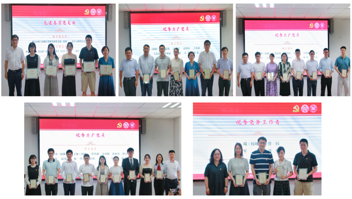 经基层党支部推荐并报学院党委研究决定,模式分析与智能计算研究所党支部等5个党支部获“先进基层党组织”荣誉称号,马维华等26名党员获“优秀共产党员”荣誉称号,朱琨等4名同志获“优秀党务工作者”荣誉称号。学院党员领导班子成员向受表彰的先进集体和优秀个人颁发荣誉证书,并合影留念。