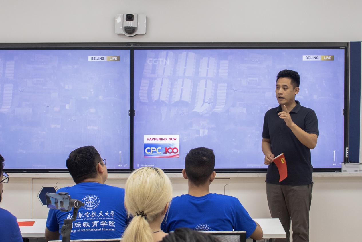 在观看庆祝大会后,金泉元给在场留学生们上了一堂具有特别意义的中国文化课。他深情地讲述了中国共产党给中国带来沧桑巨变,带领中国人民过上幸福生活的历史。他强调中国共产党是为中国人民谋幸福的政党,也是为人类进步事业而奋斗的政党。值此建党100周年之际,他希望大家不忘习近平总书记在给留学生们回信中的嘱托,更加深入地了解真实的中国,把想法和体会介绍给更多的人,同时鼓励留学生们借助学校搭建的文化体验与交流平台,深入了解中国共产党,了解中国,讲好中国故事,传播好中国声音。希望同学们志存高远,为促进人类共同进步和发展做出贡献。