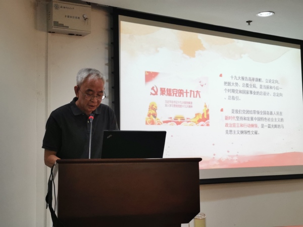杨名大从十九大的召开讲起,明确十九大的重大历史性贡献之一就是把习近平新时代中国特色社会主义思想确立为党的行动指南,实现了党的指导思想的又一次与时俱进。随后从习近平新时代中国特色社会主义思想产生的时代背景、思想的核心内容和历史贡献、开启全面建设现代化的新征程三个方面具体展开论述。杨名大指出:习近平新时代中国特色社会主义思想是对马克思列宁主义、毛泽东思想、邓小平理论、“三个代表”重要思想、科学发展观的继承和发展,是马克思主义中国化最新成果,是党和人民实践经验和集体智慧的结晶,是中国特色社会主义理论体系的重要组成部分,是全党全国人民为实现中华民族伟大复兴而奋斗的行动指南,我们必须长期坚持并不断发展。杨名大号召全体党员要坚决拥护中国共产党的领导,在以习近平同志为核心的党中央领导下向着“新时代”的“长风破浪会有时”的明天迈进。