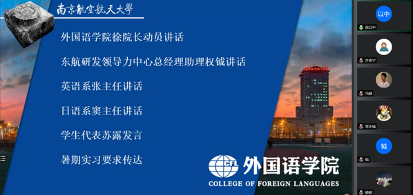 7月10日,学院召开暑期实习线上动员会。徐以中、英语系主任张立新教授、日语系主任窦硕华副教授、东航技术应用研发中心领导力中心总经理助理权钺、东航北京分公司服质部韩琳老师以及参与暑期实习的师生出席了动员会,暑期实习负责教师王孝存副教授主持了会议。徐以中传达了学校围绕立德树人根本任务,按照“以服务谋合作,用贡献促协同”的理念加强企业项目式实习及探索建设共享型人才培养实践基地的要求,指出实习教学是本科人才培养中的重要环节,要求参加暑期实习的全体师生严格按照学校有关部署,确保高质量的安全的实习。权钺代表企业回顾了双方成立民航外语联合科创工作站以来持续丰富校企合作内涵的过程,表示将尽全力与企业项目式实习的师生一同学习,一同探索,一同成长。