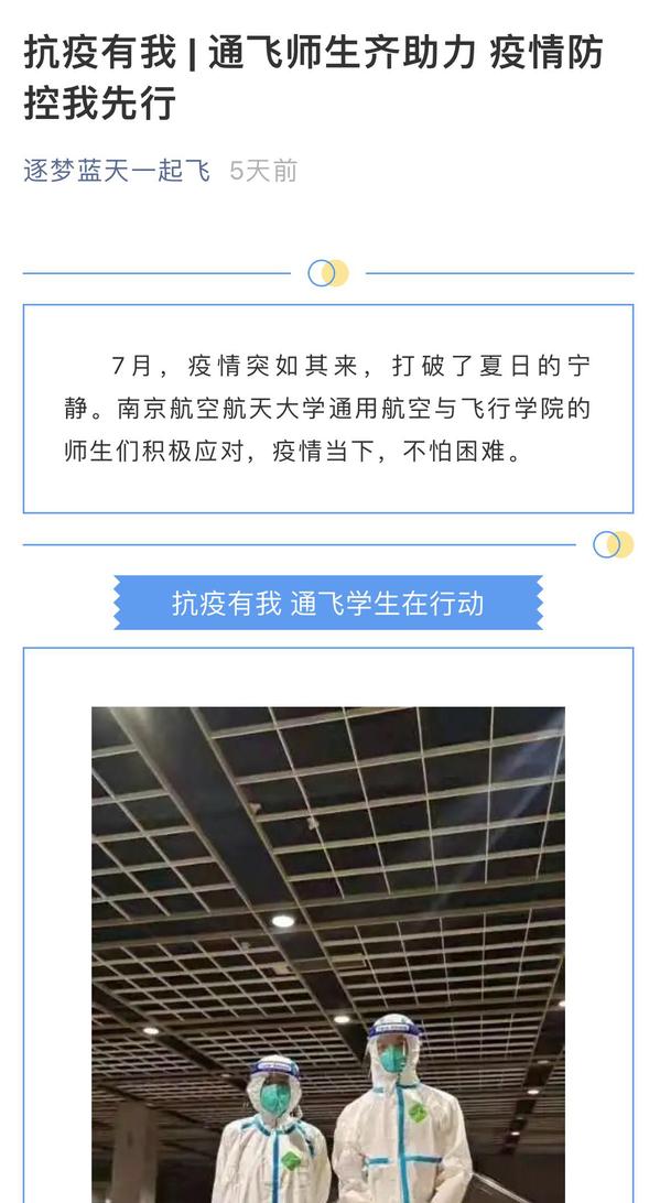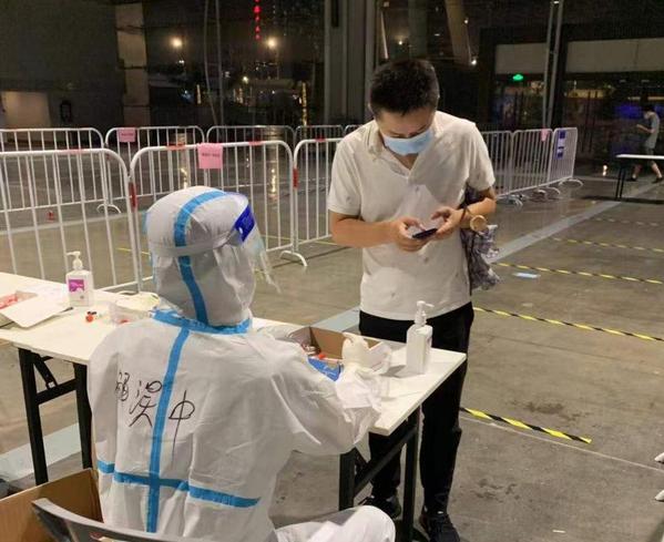 解淏中同学参与了南京市防疫志愿者活动。7月25日晚21时至24时,在南京市玄武区新庄国际展览中心进行核酸检测人员的信息登记志愿服务。此外,8月1日解淏中同学还将前往南京市玄武区孝陵卫街道康定里社区封控小区参与配送物资的志愿活动。通飞学子心系社会,在自己确保安全的情况下,主动志愿投身抗疫一线,尽显当代青年本色。