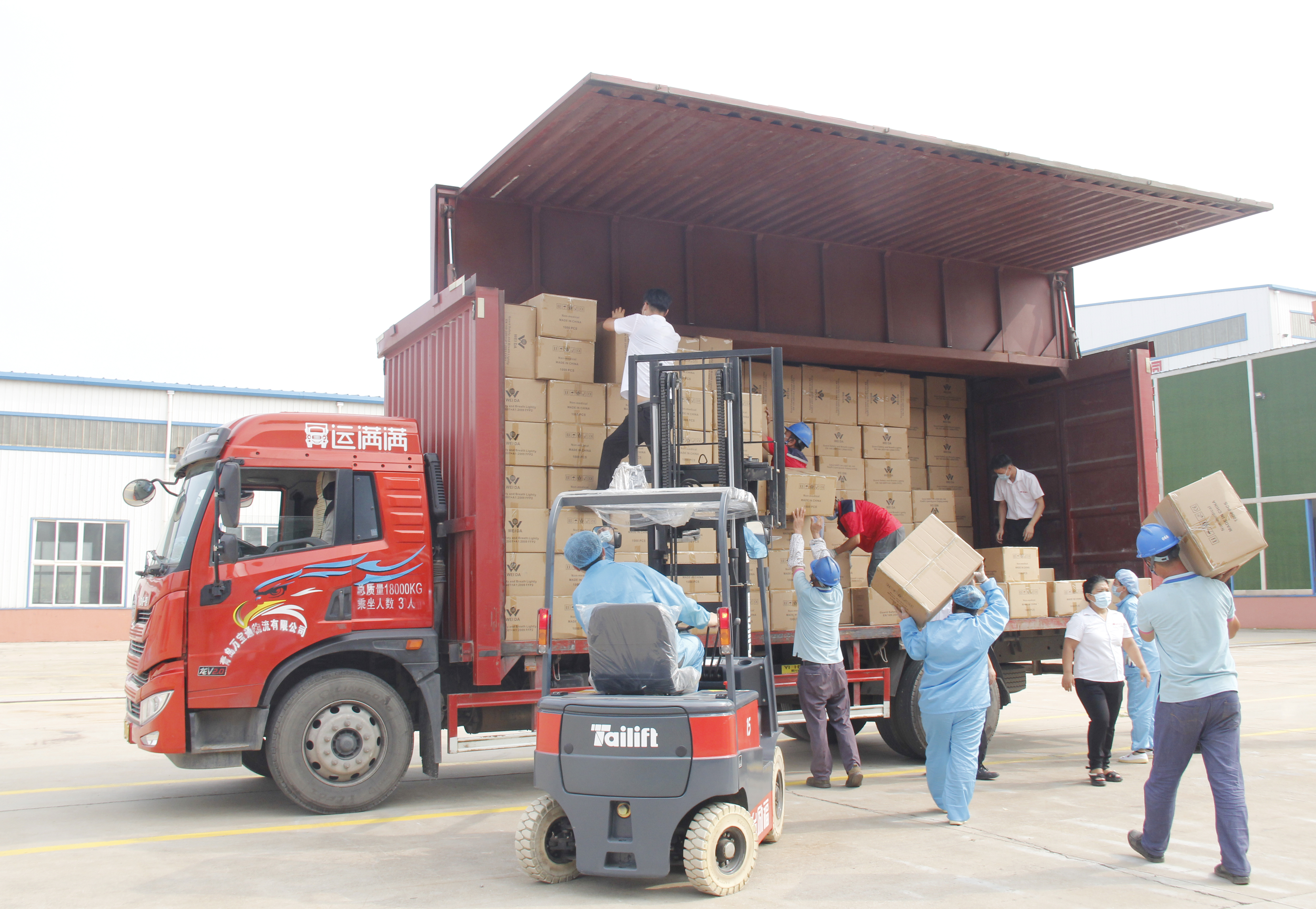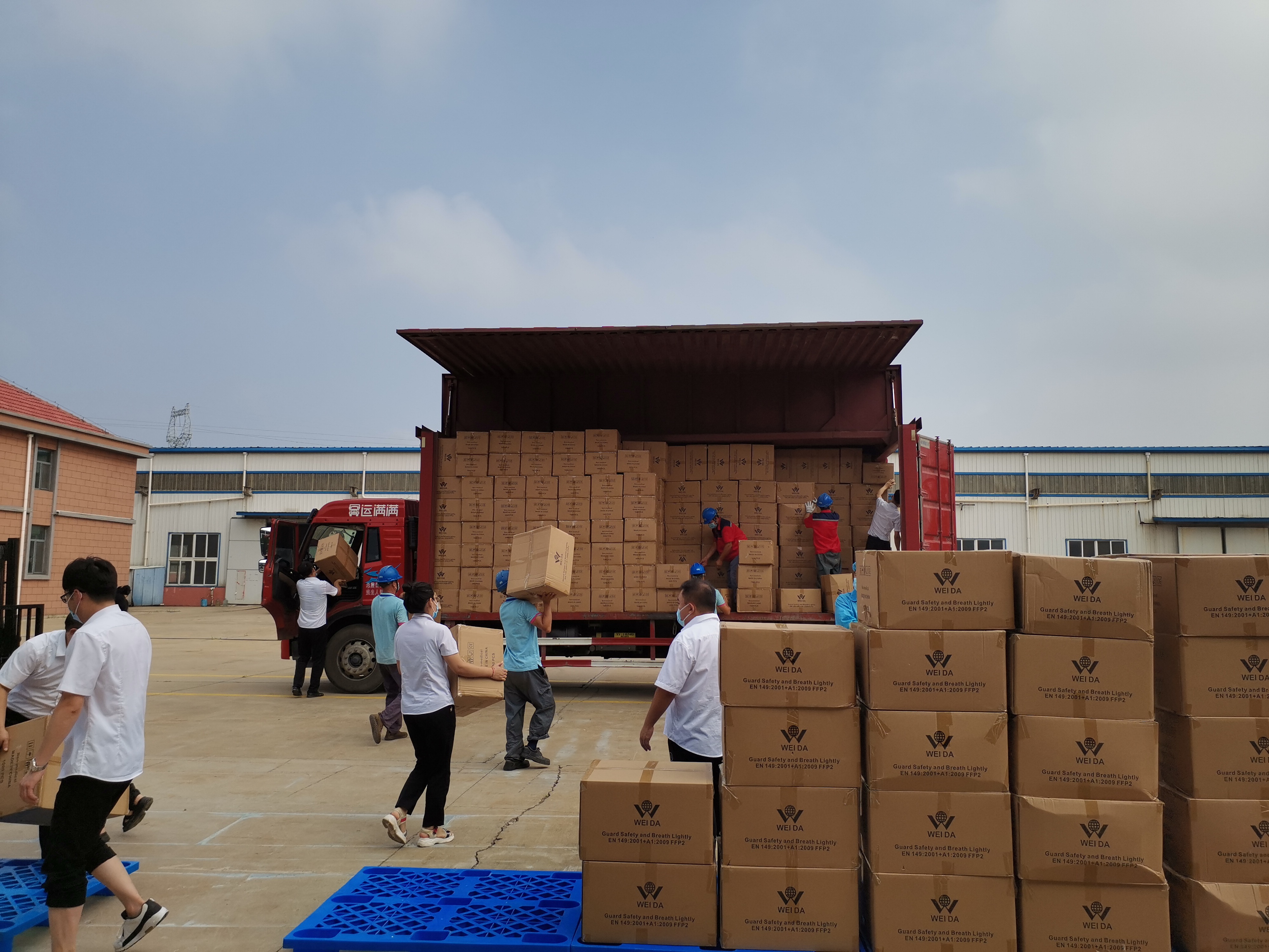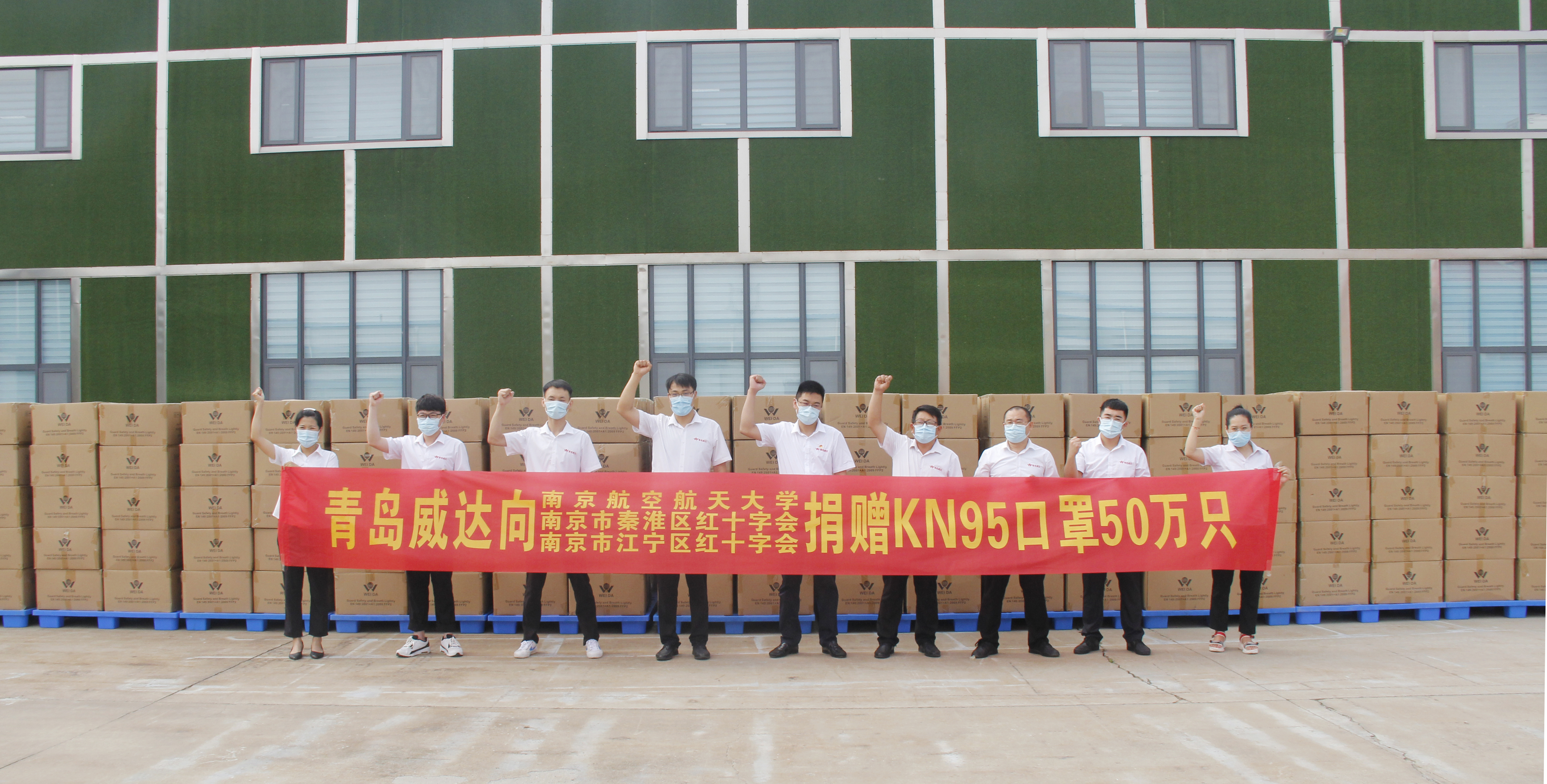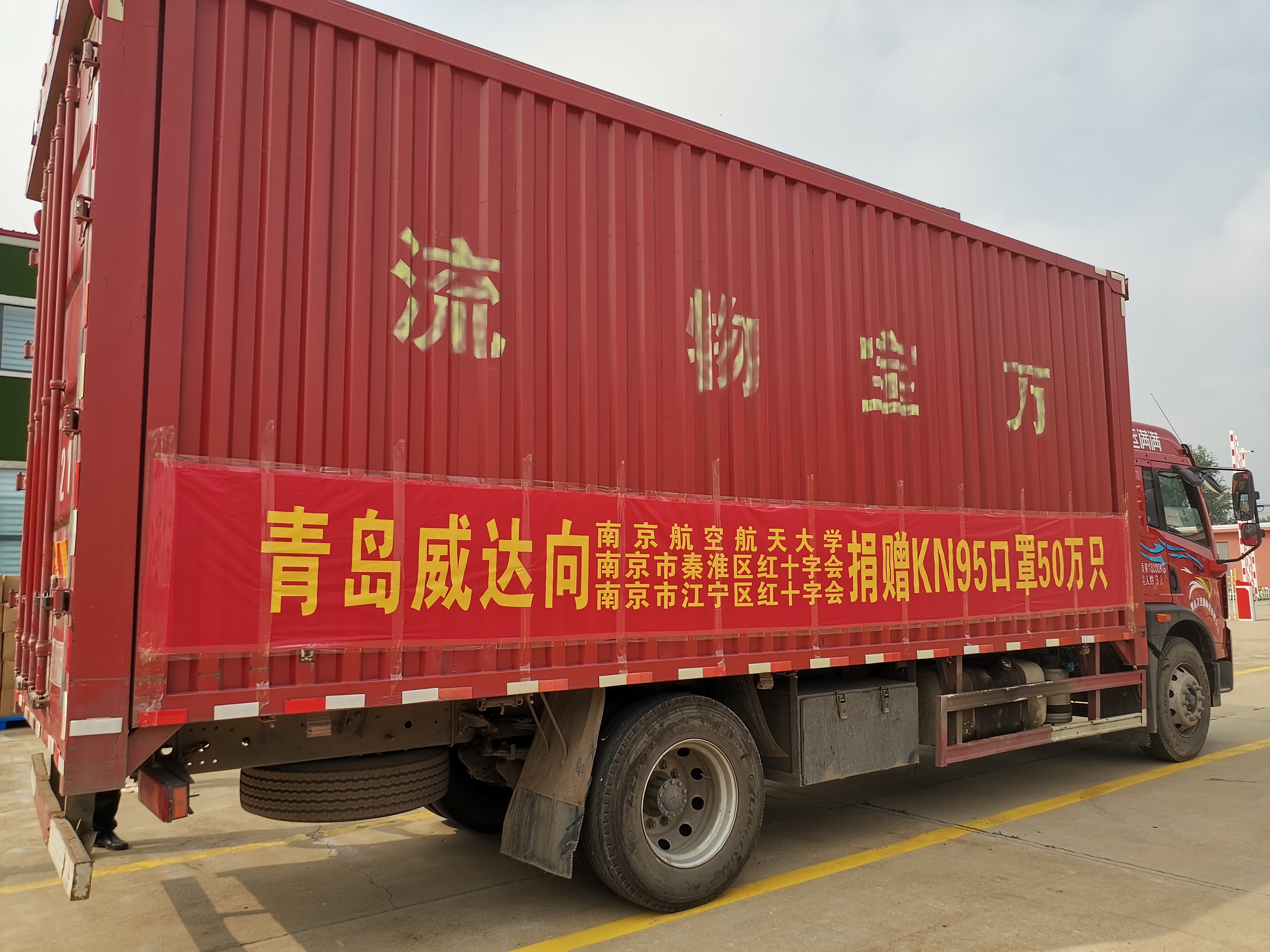 8月2日上午一辆满载着青岛威达爱心的货车驶出青岛威达机械制造有限公司的大门,车上装载着青岛威达为助力南京抗疫加班加点赶制的50万只高品质KN95口罩。