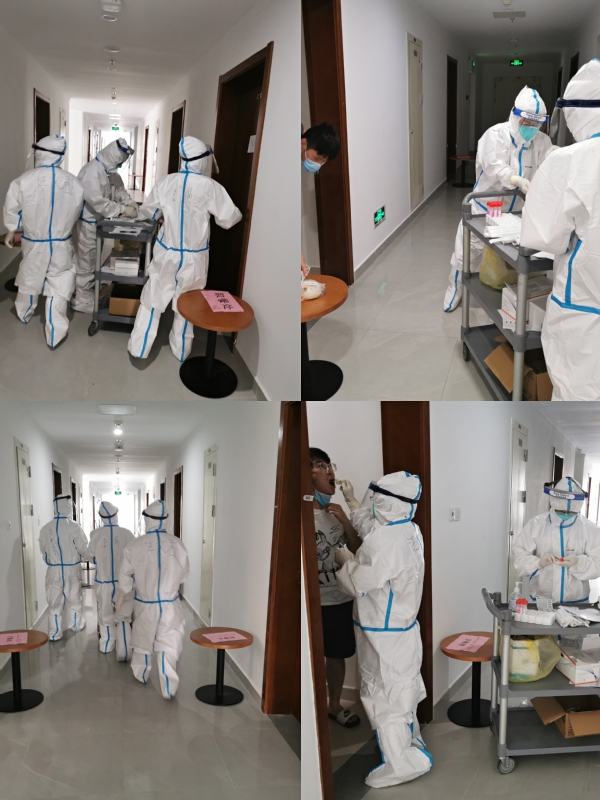 一名党员就是一面旗帜,一个支部就是一座堡垒。早晨不到8点,第一批党员服务小组成员到达校内隔离区外专楼大厅采样检测点报道,志愿者们认真学习工作流程,听从指挥分赴隔离区各个楼层,协助医护人员开展核酸检测准备工作。在没有空调的隔离区走廊,每组成员身着全套防护服,不畏炎热和辛苦,一遍遍检查用品是否数量齐全,一个个房间逐一上门检测,一句句嘱咐隔离区同学做好防护,提高免疫力。从三尺讲台到抗“疫”前线,老师们用自己实际行动诠释着大爱精神,高效率完成隔离区146人所有检测工作。