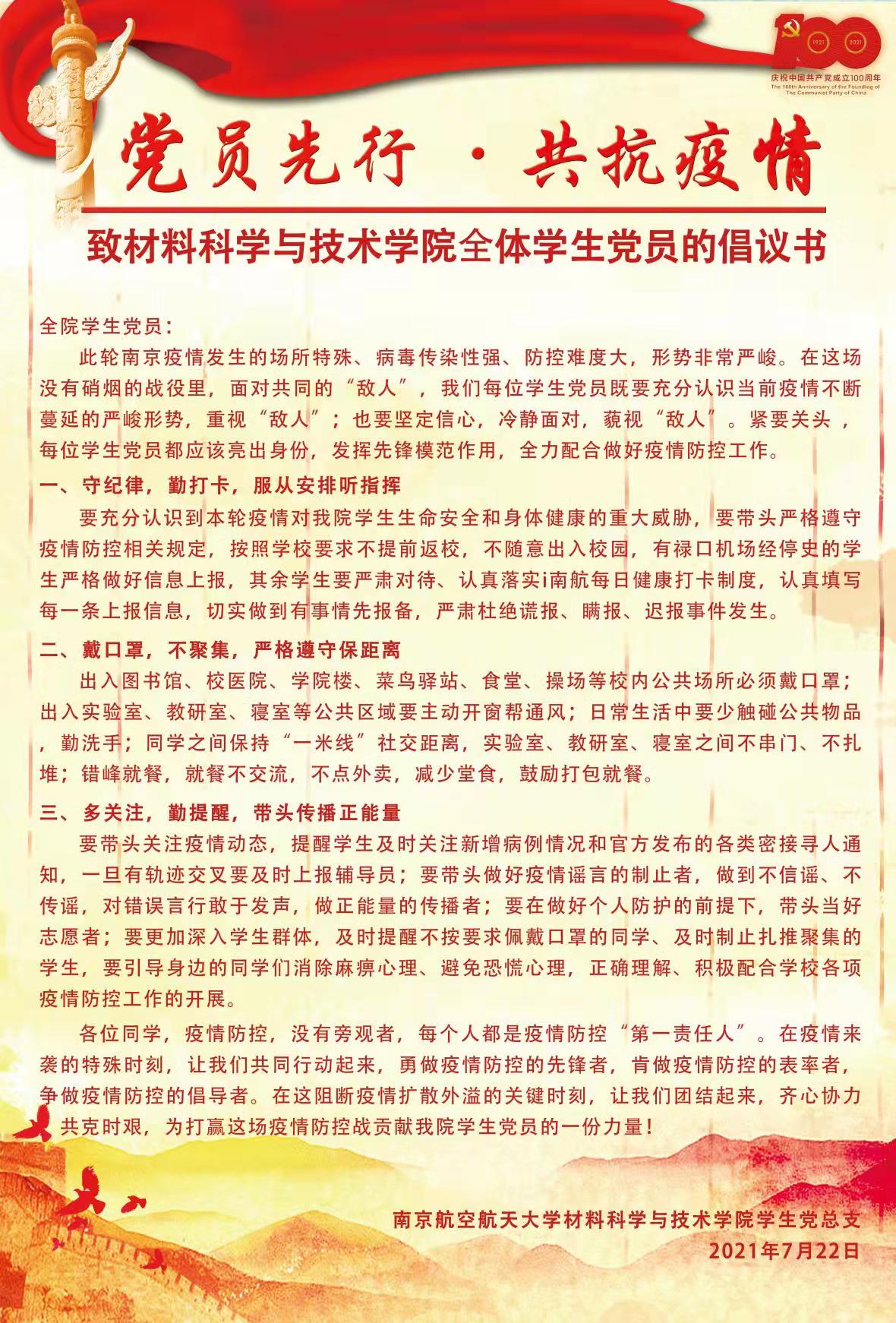 7月20日南京暴发疫情以来,材料科学与技术学院师生积极投身到疫情防控工作中来,“材料楼复材实验室已全面消杀”、“研究生一支部所有成员已完成打卡”、“2020级全体学生已完成打卡”、“‘涝疫’期间每日数据已更新”、“我已于今天解除隔离,请老师放心”、“值班巡楼已完成,安全”……每天上午11点,材料科学与技术学院各防疫工作群里消息不断,全院师生积极投身到疫情防控工作中,他们用行动传递了疫情中的爱与温暖,让我们看到了一幕幕感人的画面。