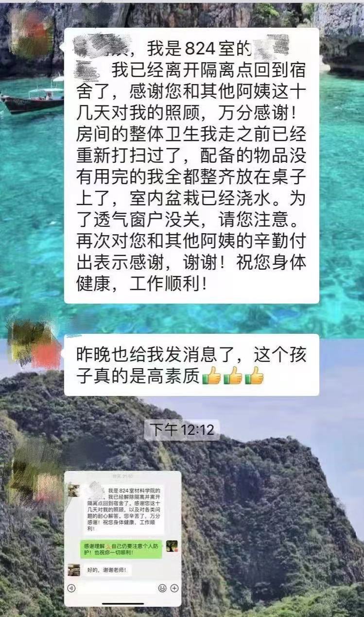 材料科学与技术学院博士研究生王飞云解除隔离当天,他的一条微信引起了老师们的注意,离开集中隔离点时他选择了一声感谢并把房间打扫干净、物品摆放整齐、给盆栽浇水、并提醒窗户未关。字里行间体现的是对学校的宽容、理解与感恩,虽然不能奔赴抗疫一线,他却用另外一种方式温暖着抗疫一线的工作人员。为此阿姨专门去他的房间拍摄了视频,房间同未入住一般干净整洁,老师、同学们纷纷竖起大拇指,为他点赞!