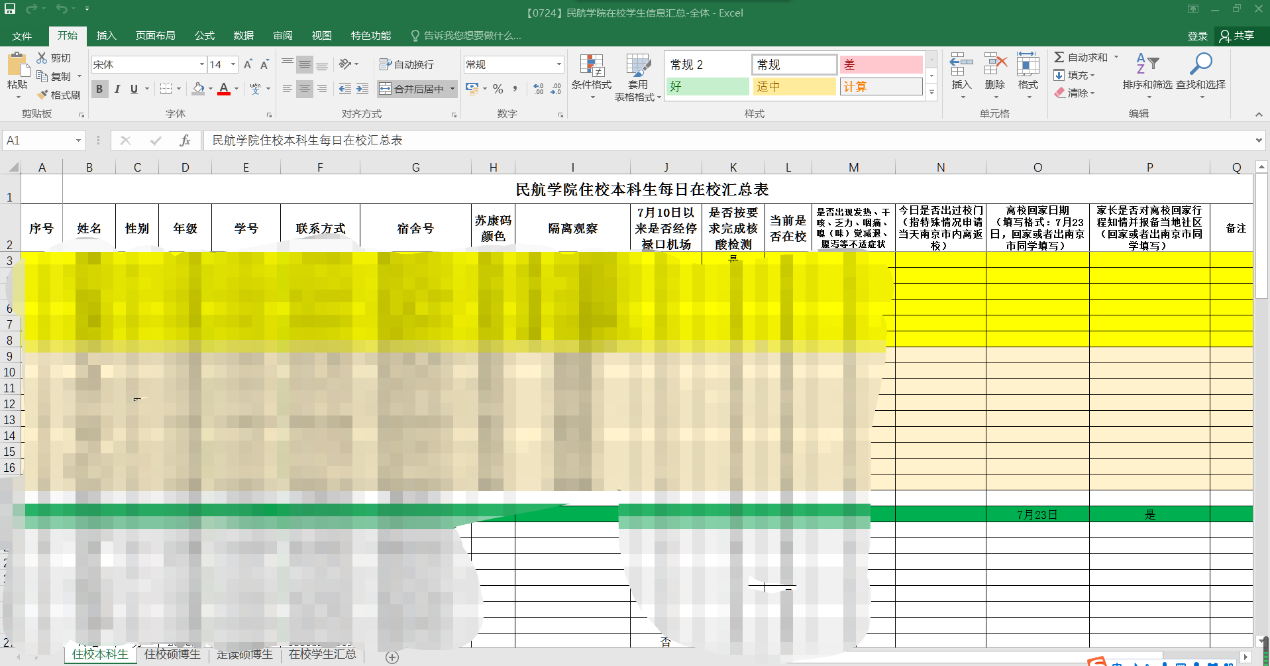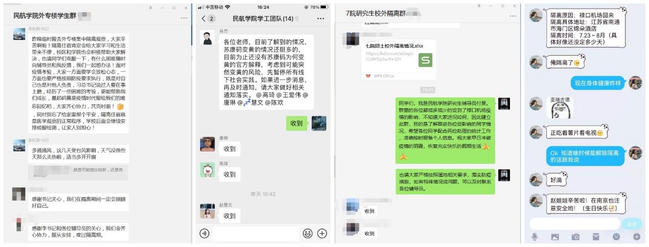 目前,学院有408名学生因复习备考、社会实践、科研、实习等原因留校,其中本科生71人,研究生337人。在疫情反复、极端天气频发的关键时期,民航学院推出一系列有速度、有力度、有精度的暖心之举,多渠道加强与学生的联系,关心关爱学生。学院领导直接对接外专楼隔离点学生,第一时间送去学院的关心,通过微信群及时了解学生动态和诉求并协调处理;各年级建立校外医学隔离学生联系群,关注校外隔离学生的身心健康;院领导及辅导员先后走访慰问留校学生、给校内隔离点学生送防疫生活物资、为学院实验室配发防疫消毒用品;点对点了解河南籍学生家中情况,关心实践实习学生,落实关爱政策措施;执行在校本研学生每日信息更新制度,做到在校学生信息“一日一更新”、返乡学生离校-途中-到家“全过程关注”。在院领导及学院老师的关心引导下,留校学生落实学校各项防疫要求,积极配合完成各项疫情防控工作,并始终保持良好的生活和学习心态。