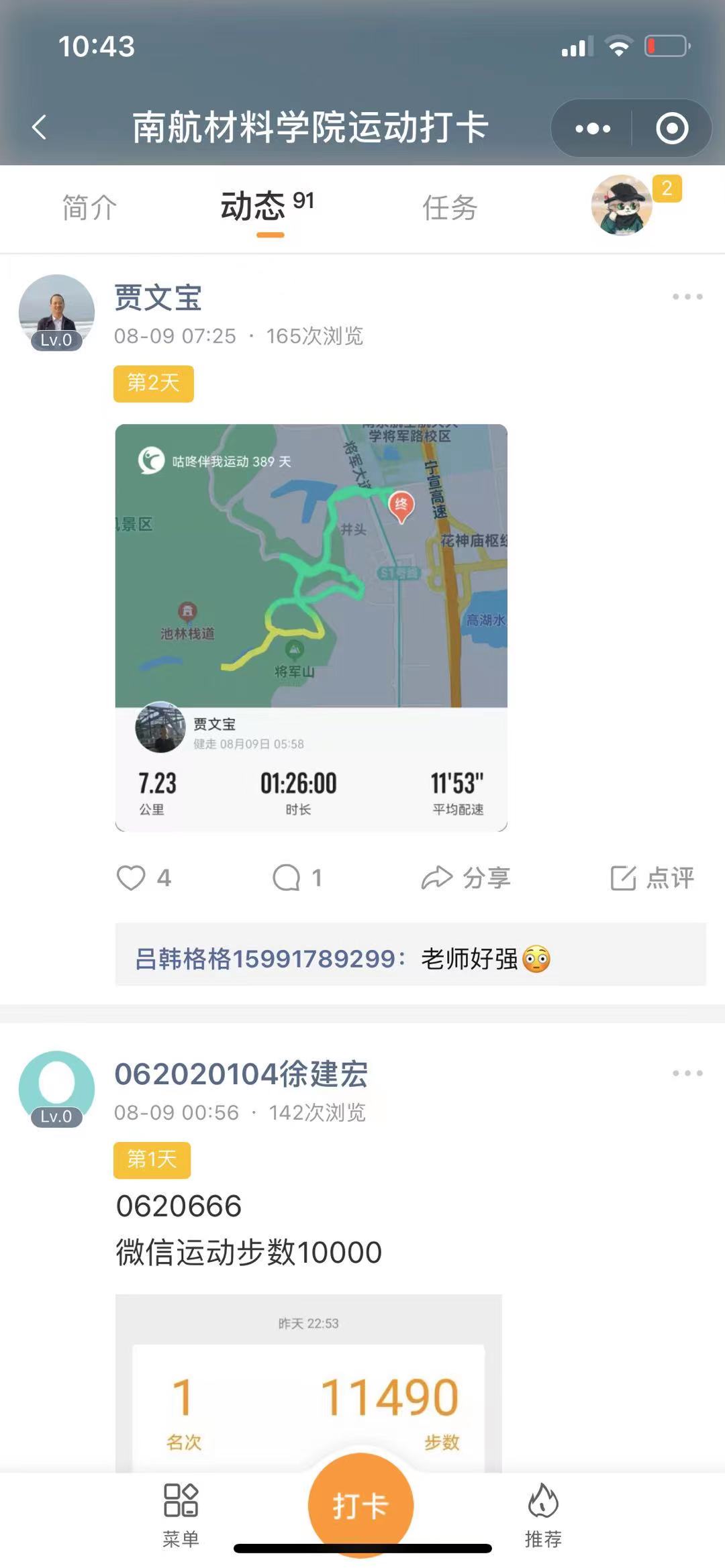 8月8日,我国奥运健儿以88枚奖牌总数的成绩结束了东京奥运会的征程,8月8日也是第十三个“全民健身日”,当天材料科学与技术学院面向全体师生开放“南航材料学院运动打卡”圈,步数达到一万步、锻炼达到30分钟就可以进行打卡,活动当天圈内成员达110人,参与打卡58人次,材院师生纷纷发布运动状态,有操场跑步的、有紫金山跑步的、有跟着keep软件锻炼的、有跳绳的、打篮球的、打羽毛球的……不管是在校还是居家,师生们都积极参加体育锻炼。该活动长期有效,每月根据打卡次数进行排名,对前十名师生给予奖励,根据跑步图案也会评选最具创意奖、最有毅力奖、最长距离奖以及最快速度奖等。