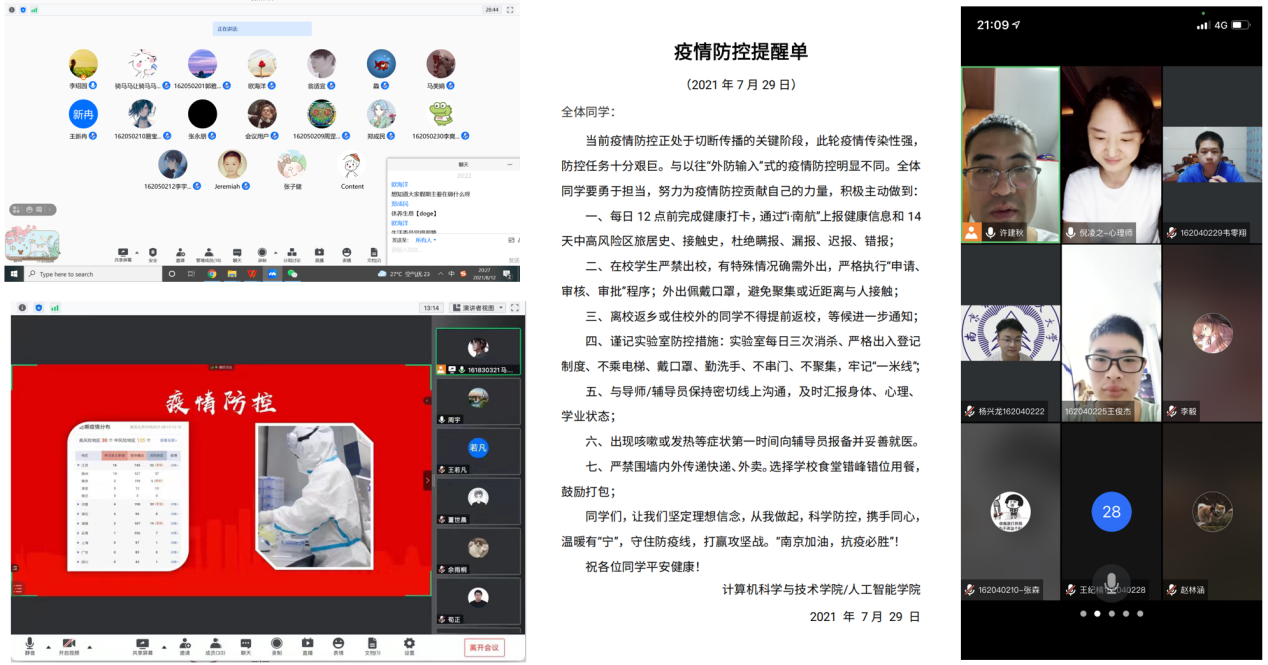 暑假期间新冠疫情的突然反弹,打乱了许多师生的学习生活计划。为了让学生们明确目标,调整心态,计算机科学与技术学院组织全体本科生班主任立足于学生成长特点和阶段性学习需要,结合当下的疫情防控教育,积极开展“云端”班会,涉及3个年级38个班级,实现了在校本科生全覆盖,促进学院学风建设工作质量提升。