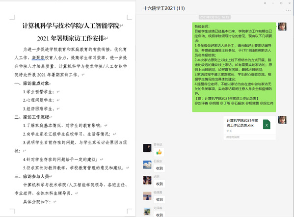 为精准落实大学生思想政治教育工作,帮助学生制定科学清晰的发展目标,减少学生与家长的教育困惑与思想顾虑,促进家校教育的有效衔接,让学生工作更有温度和深度。计算机科学与技术学院/人工智能学院于2021年暑期以线上线下相结合的方式,对近20名学生开展了家访工作。学院党委副书记管祎、院长助理李鑫、相关班主任、专业老师及辅导员参与了家访工作。