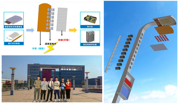 荣获一等奖的项目“Shining for purity——高效废热回收自驱动智能净化新型照明装置”由刘向雷、宣益民教授指导,团队由本科生胡天辰、孙赵轩、尹炳雄、杨志鹏、韩旭、张睿婧组成。针对我国每年户外照明用电量大、产生废热多、空气污染严重等问题,团队设计制作了高效废热回收自驱动智能净化新型照明装置。装置基于Seebeck效应,利用热电片回收废热;采用热管与相变材料耦合,结合翅片风冷等方式联合制冷;蓄电池充电后通过控制电路向智能净化装置供能,当传感器探测到污染物浓度超标时,高压电晕净化器开始工作。这种方法还可推广到家电、探照灯、变压箱、大型公共场所照明等领域,就目前的抗疫常态化形势下,利用公众场合大型电器废热产电进行就地消毒,可以达到节能与防疫双目标,形成了“废能回收 就地利用”的节能减排新思路。